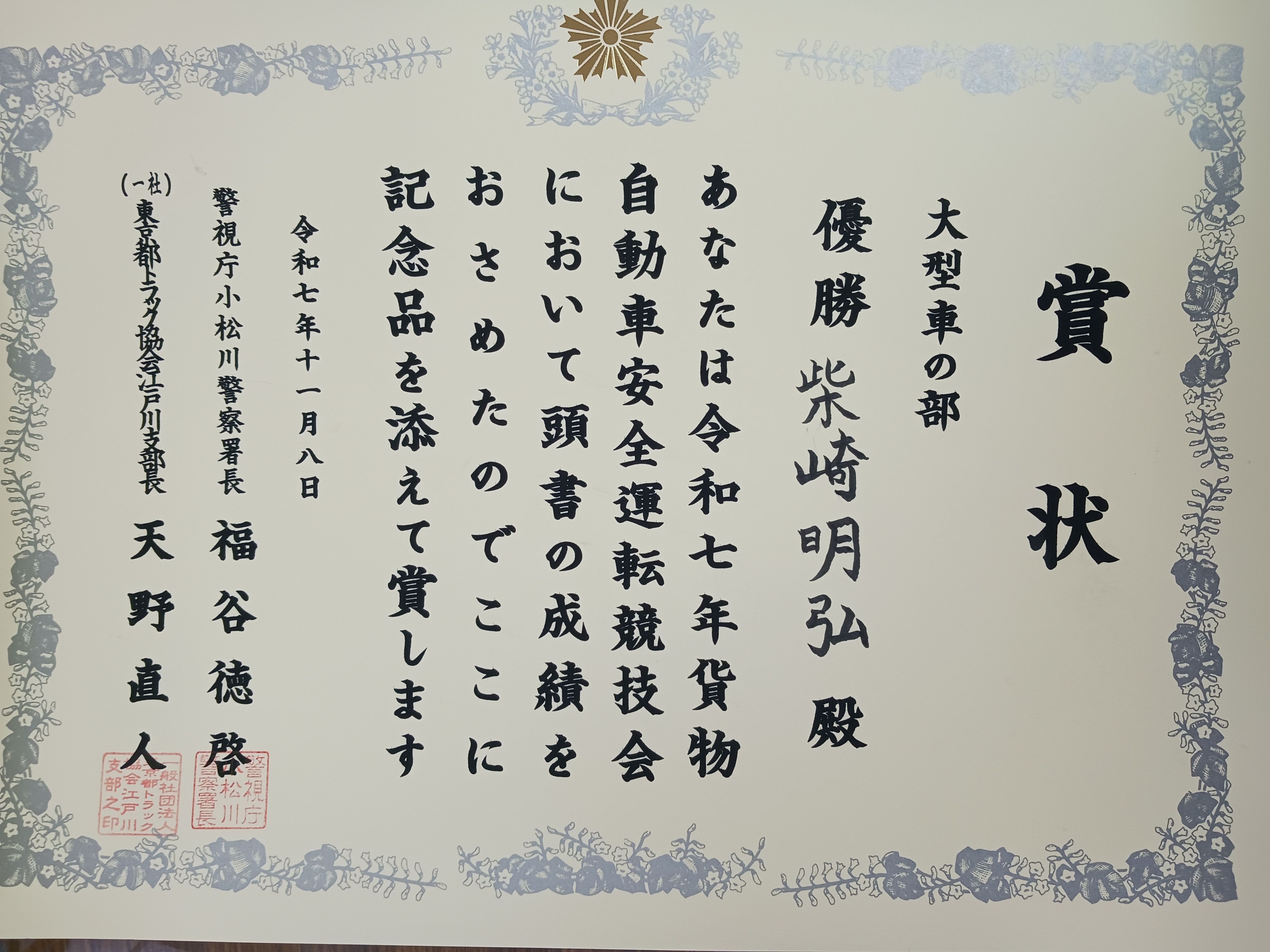 社員一同、柴崎の活躍を大変誇りに思うとともに、これを励みに、今後も安全運転・安全配送を一層徹底してまいります。